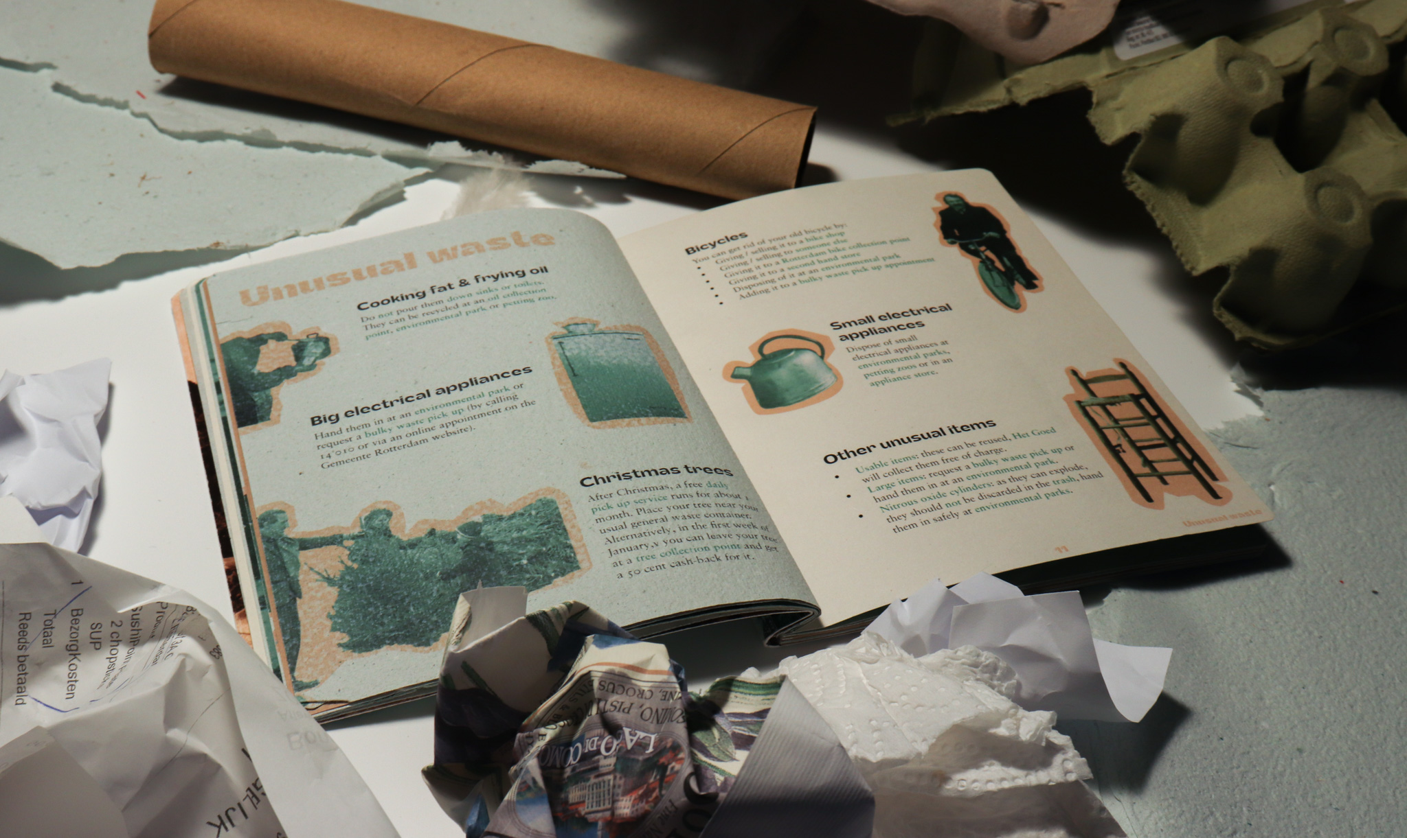 After Life is a publication about waste after life in Rotterdam, designed to engage readers with short attention spans through visuals and interactive design. By transforming a typically overlooked topic into a captivating experience, the project uses specific typography, selective colour, and playful layouts to sustain interest while highlighting the importance of recycling. Features include pull out cards, clear pages as well as flaps to reveal information. Printed entirely on recycled and handmade paper, the book itself embodies its message of giving waste a second life. Created in Adobe InDesign, After Life served as both an editorial design exercise and a reflection on sustainability, allowing me to experiment with microtypography, composition, and time management within a meaningful environmental context.